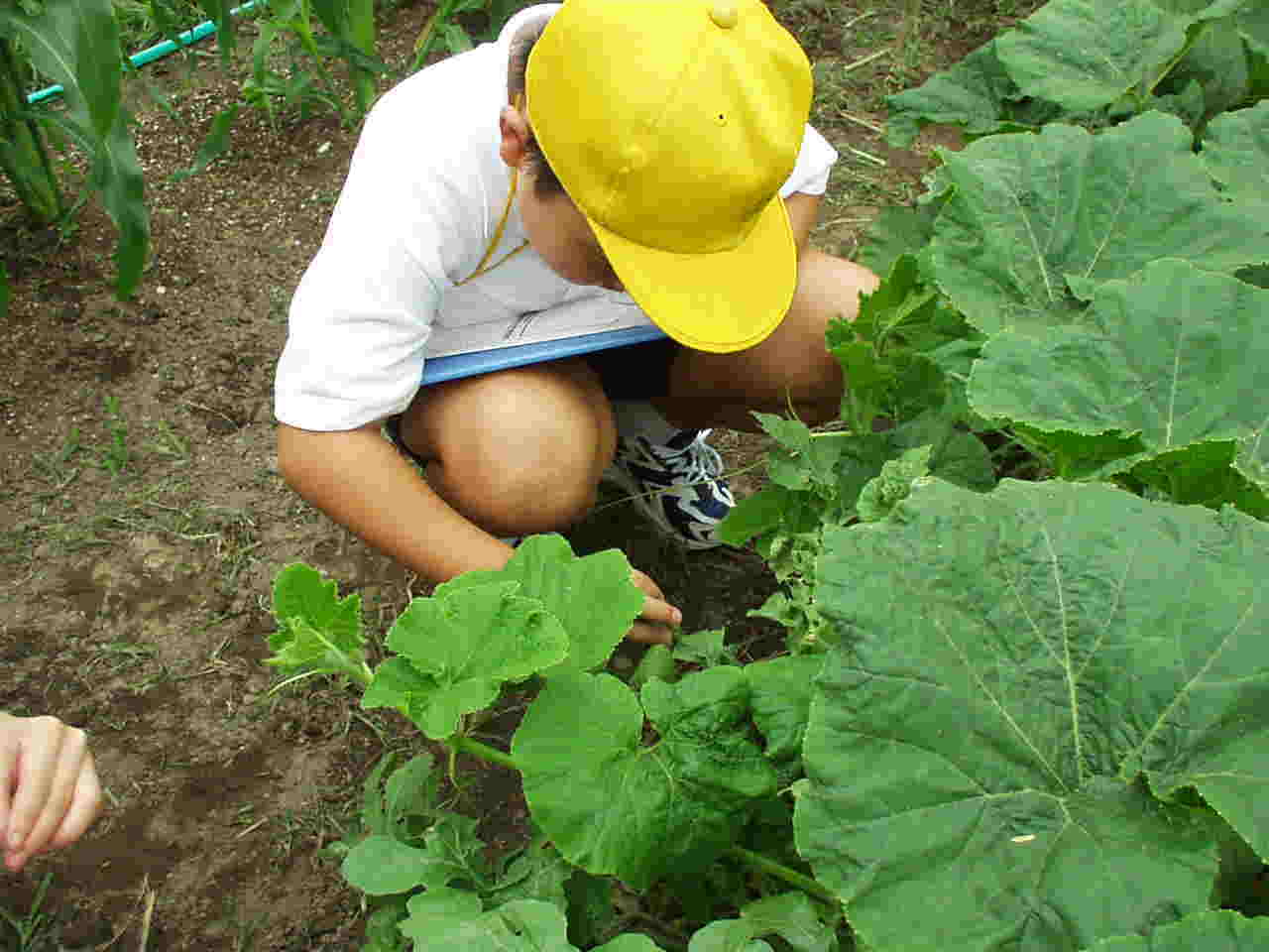 | 5月22日 苗の様子の観察 ○畑の整備(草ぬき・耕し) ○パソコンで畑に苗を植え替える方法を調べる。 5月24日 ケナフ・ジャガイモグループは畑の整備(肥料を混ぜる・畝作り) カボチャ・スイカ・メロングループは畑の整備(肥料を混ぜて畝を作る) トウモロコシ・キュウリグループは畑を耕して、肥料を混ぜうねを作り,苗を植え替える。 5月29日 ○苗の移植 ○植え替えた苗の観察 ○水やり当番を決める ○キュウリを枯らしてしまったので,枯れないように最後まで育てるにはどうしたらいいか話し合いをする。新しい苗を畑に植えて観察する。 ○水やり当番についてもう一度話し合い当番表を作る。○苗の観察 ○防虫・保温のためのカバーをかける |