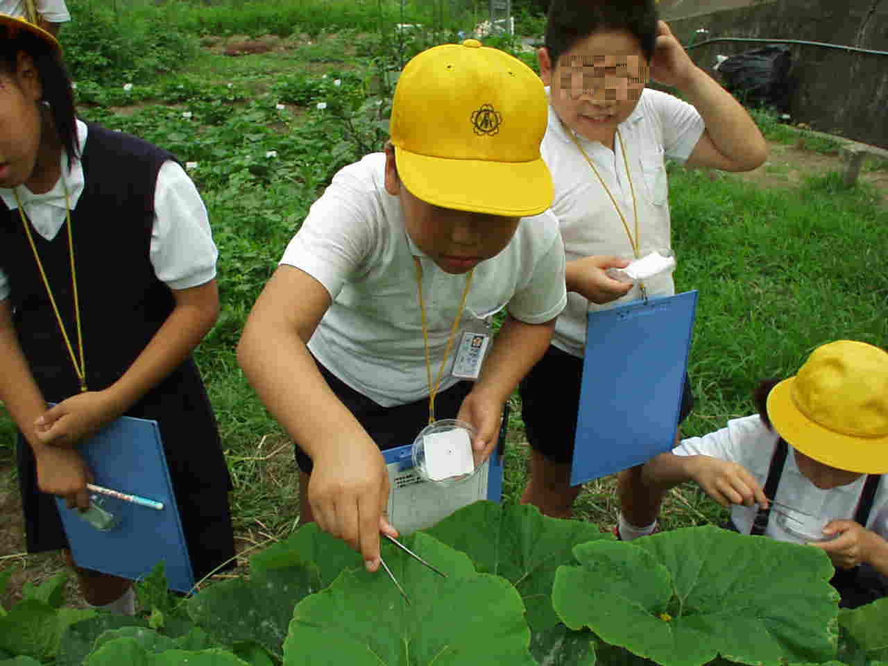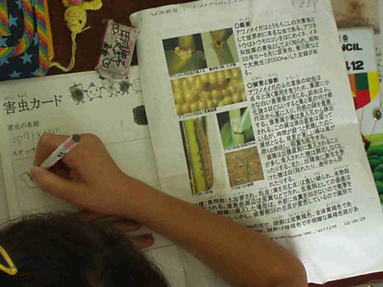 | 6月19日 パソコンで害虫や苗の病気について調べる。草抜きをし、土と肥料を混ぜ合わせ根元に蒔く。倒れているトウモロコシの根元に寄せ土をする。 ○伸びたツルを針金でネットに結びつける。キュウリの小さな実を取り、アブラムシの卵の駆除。 6月26日 成長した苗の観察 と苗の世話(草ぬき・土寄せ・追肥) ○パソコンで害虫について調べ,資料をプリントアウトする。 ○カボチャやスイカの防虫カバーを取り除き、敷きわらをしく。 7月4日 ○ケナフ、ジャガイモグループは、食べ方を本、パソコンで調べる。 ○トウモロコシ、キュウリグループは前回プリントアウトしたものと,資料を見て,どんな害虫がいるのか,どうやったら害虫から野菜を守ることができるのか,グループごとにまとめる。 ○スイカ、カボチャ、メロングループは、害虫による被害を調べ、害虫や、害虫痕のある葉や茎を採集し、今後の対策について考える。 | アワノメイガって、どんな害虫なんだろう? |