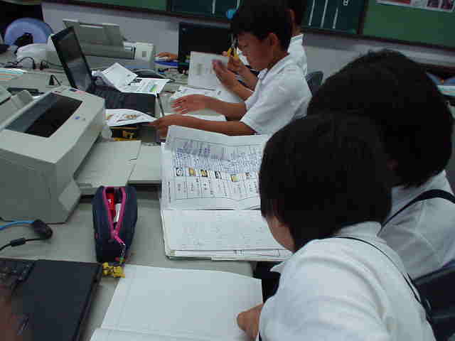 7月10日 ジャガイモは、地下の様子も含めて育った様子を観察する。 ○ケナフは倒苗防止の支柱を施しながら観察する ○トウモロコシは、草抜き。水やリ。寄せ土をし、観察。夏休みの水やりについて話し合う。 ○カボチャ、メロン、スイカグループは、パソコンを使って、害虫や病気について調べ、対策を立てる。 7月17日 全グループは、育った様子の観察し、夏休み中の世話の計画と当番を決める。 |