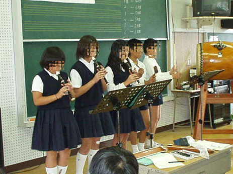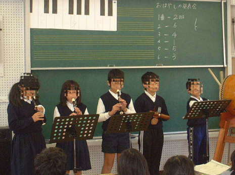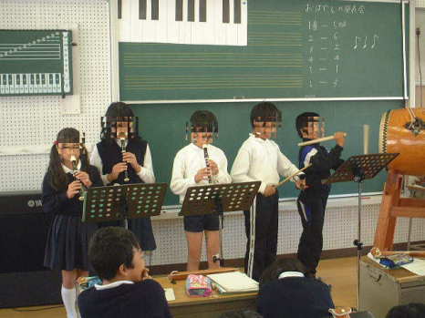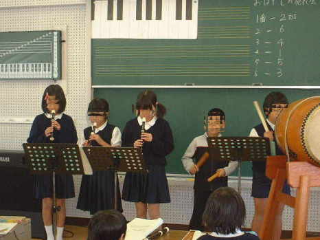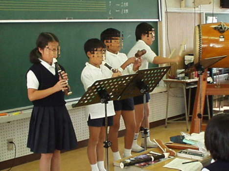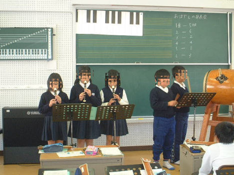 5年生は運動会終了後、祭り囃子の創作活動をしました。 写真は各クラス、各班の発表の様子です。 活動手順 1.日本の音階である、レ・ミ・ソ・ラ・ド・レ・ミ・ソ を使い、リコーダーでお囃子の旋律を創作しました。 2.旋律にあう和太鼓のリズムを教科書を利用して組み合わせました。 3.鳴り物楽器の設定(各班自由)(例:ウッドブロック・クラベス等) 4.各班で祭り囃子の練習をしよう。 5.『祭り囃子』の発表会をしよう!!