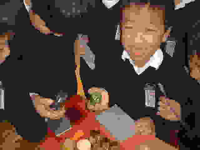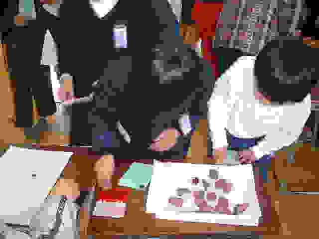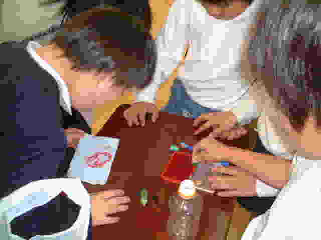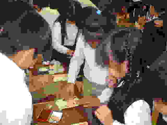 | 青空学きゅうの友だちと いっしょに 紙すきをしたよ! 水にぬらしたパルプを 小さく切って、シェイク、シェ〜イク!! |