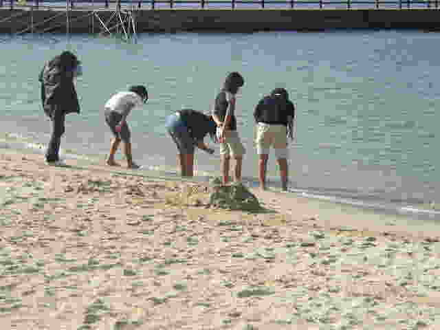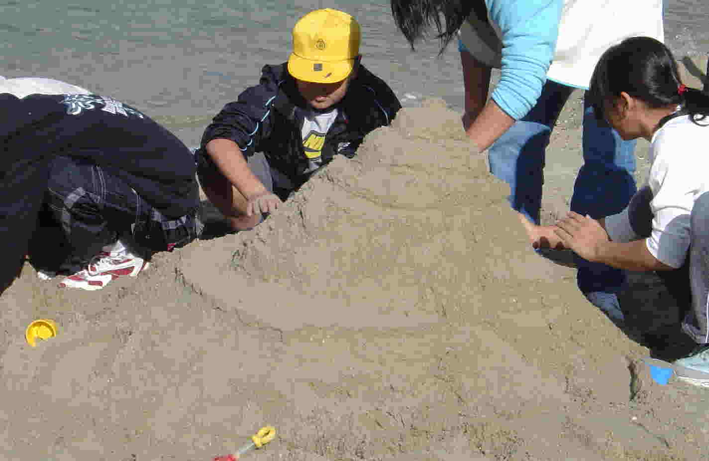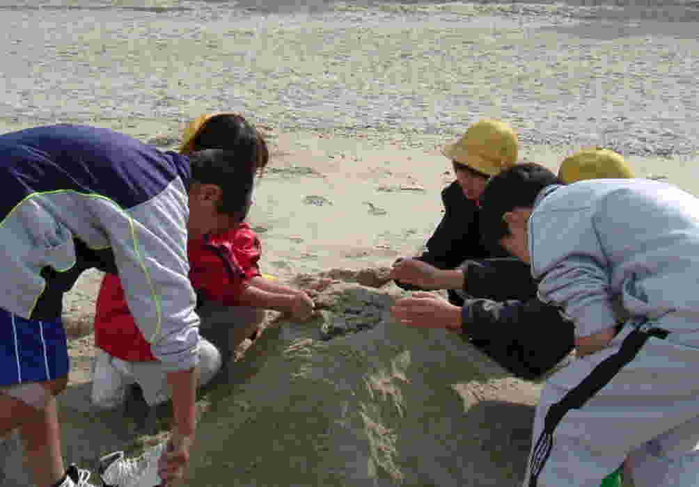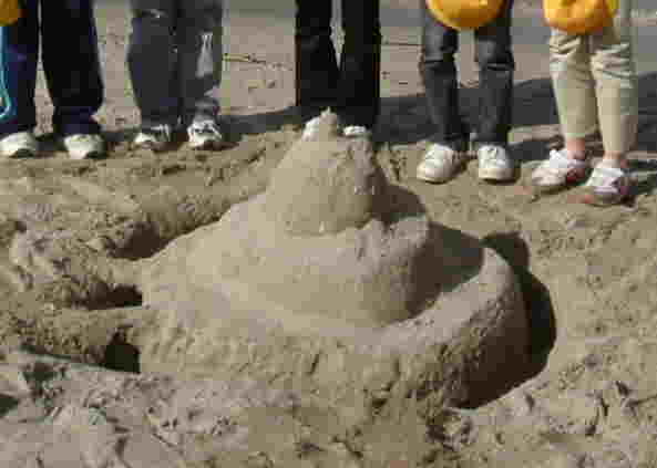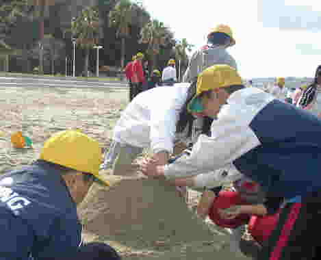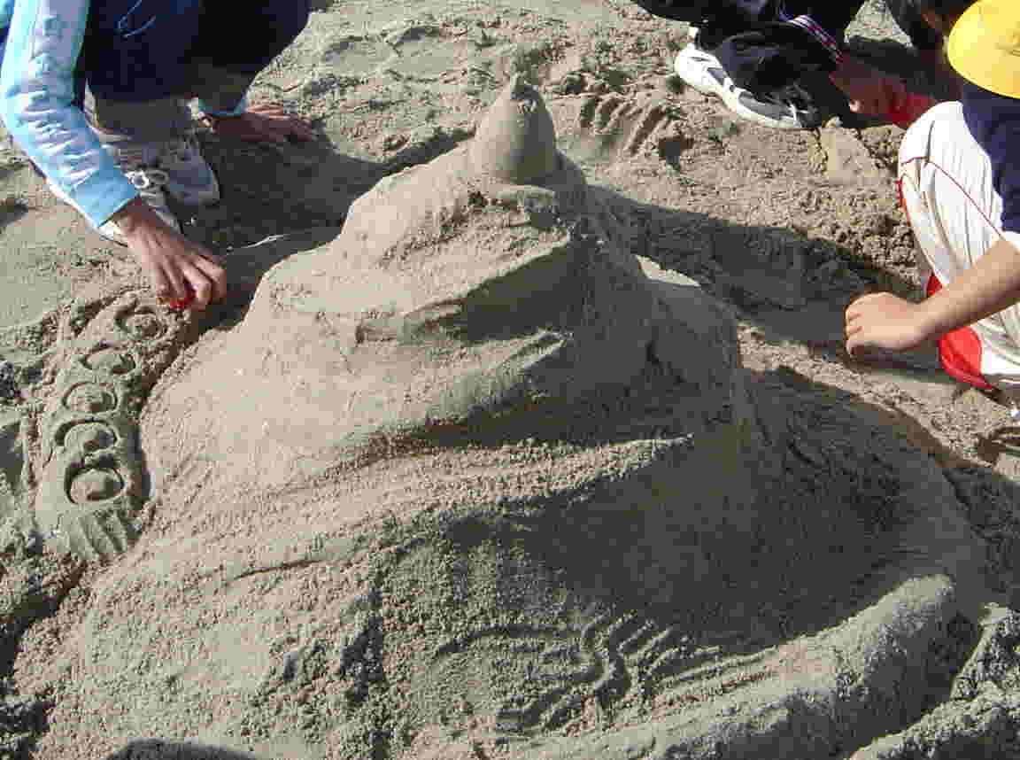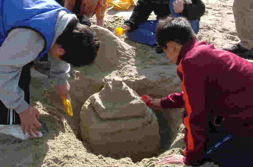 | 班ごとに分かれて、「城」作り開始!! テーマを知らされたのはほんの数分前ですが、さっと場所を決めてとりかかります。 さすが6年ともなると、チームワーク、アイデアが光ります。 上に砂を積む班あり、逆に地を掘り進める班あり、潮が満ちてきて波打ち際で波と戦う班あり、さまざまです。 |