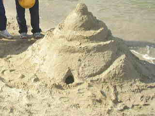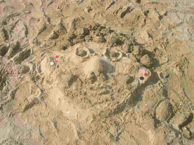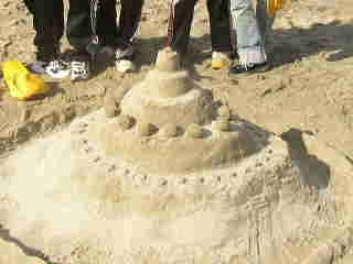 | どうでしょうか!?審査基準は、「とにかく高さ!!」 芸術性は2番目だったのですが、砂場遊びセットのカップを使ったり、白く乾いた砂でデコレーションしたり 各班とも力作ぞろいでした。 |